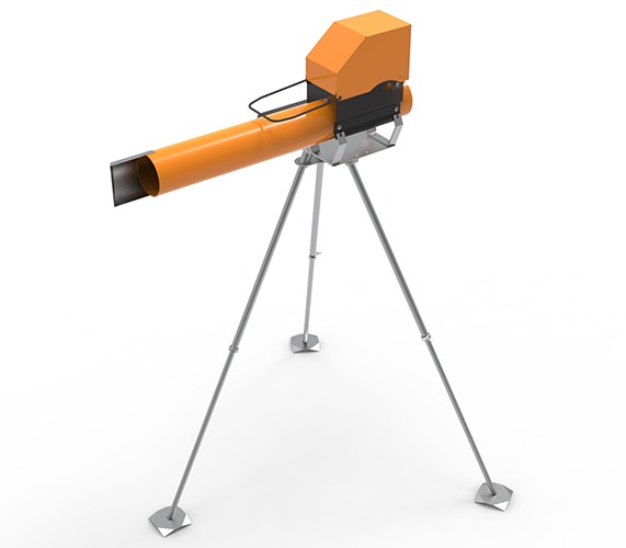 Стойка представляет собой устойчивую конструкцию с площадкой для крепления отпугивателя и тремя телескопическими ножками, высота которых регулируется для подстройки под тип поверхности. Площадка, на которой установлена гром-пушка, автоматически поворачивается при каждом выстреле на небольшой угол (15 - 30 градусов). Таким образом происходит вращение устройства вокруг своей оси на все 360°, что значительно увеличивает площадь действия отпугивателя.